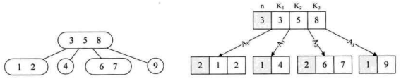 - 所有分支结点包含下列信息数据 (n, A, K, A, K, A, ···, K, A),其中:K(i=1, 2, ···, n) 为关键字,且 K<K(i=1, 2, ···, n-1);A(i=0, 2, ···, n) 为指向子树根结点的指针,且指针 A 所指子树中所有结点的关键字均小于 K(i=1, 2, ···, n),A 所指子树中所有结点的关键字均大于 K,n(m/2-1nm-1) 为关键字的个数(或n+1为子树的个数)。