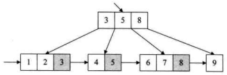 例如下图所示,就是一棵 B+树 的示意,灰色关键字即是根结点中的关键字在叶子结点再次列出,并且所有叶子结点都链接在-起。