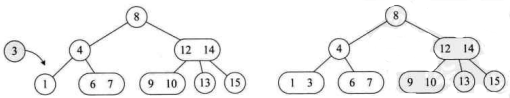 - 插入结点到一个 2 结点的叶子上。应该说,由于其本身就只有一个元素,所以只需要将其升级为 3 结点即可。如下图所示。我们希望从左图的 2-3 树中插入元素 3,根据遍历可知,3 比 8 小比 4 小,于是就只能考虑插入到叶子结点 1 所在的位置,因此很自然的想法就是将此结点变成一个 3 结点,即右图这样完成插入操作。当然,要视插入的元素与当前叶子结点的元素比较大小后,决定谁在左谁在右。例如,若插入的是 0,则此结点就是 “0” 在左 “1” 在右了。