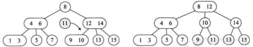 另一种情况,如下图所示,需要向左图中插入元素 11。 经过遍历可得到元素 11 比 12、14 小比 9、10 大,因此它应该是需要插入在拥有 9、10 元素的 3 结点位置。同样道理,9 和 10 结点不能再增加结点。此时发现它的双亲结点 12、14 也是一个 3 结点,也不能再插入元素了。再往上看,12、14 结点的双亲,结点 8 是个 2 结点。于是就想到,将 9、10 拆分,12、14 也拆分,让根结点 8 升级为 3 结点,最终形成如下图的右图样子。