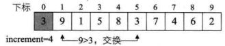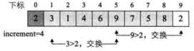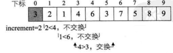 do循环后,此时由于increment=4>1因此我们需要继续do循环。第 7 行得到increment=4/3+1=2,第 8~17 行for循环,i从2+1=3开始到 9 结束。当i=3、4时,不用交换,当i=5时,需要交换数据,如下图所示。