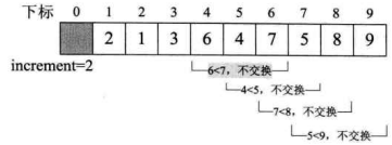 i=6,L.r[6]=7>L.r[i-increment]=L.r[2]=1, 因此不交换两者数据。如下图所示。