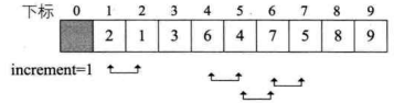 do循环,increment=2>1,再次do循环,第 7 行得到increment=2/3+1=1,此时这就是最后一轮do循环了。尽管第 8~17 行for循环,i从1+1=2开始到 9 结束,但由于当前序列已经基本有序,可交换数据的情况大为减少,效率其实很高。如下图所示,图中箭头连线为需要交换的关键字。