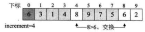 i=8,L.r[8]=6<L.r[i-increment]=L.r[4]=8,交换两者数据。如下图所示。