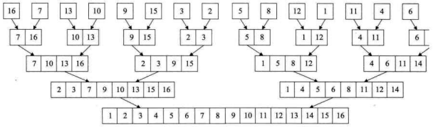 k=4,因为k<9,所以继续循环,再次归并,最终执行完第 7~10 行,k=16,结束循环,完成排序工作,如下图所示。;