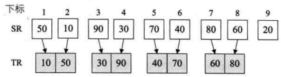 MergePass时,s=2,第 5~9 行的循环,由第 8 行的i=i+2×s可知,此时i就是以 4 为增量进行循环了,也就是说,是将两个有两个记录的有序序列进行归并为四个记录的有序序列。最终再将最后剩下的第九条记录 “20” 插入TR,如下图所示。