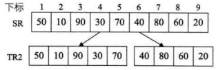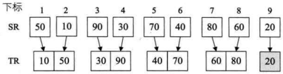 k++得到k=2,SR[i]=SR[2]=30,SR[j]= SR[6]=20,SR[i]>SR[j],执行第 9 行,TR[k]=TR[2]=20,并且j++,如下图所示。
