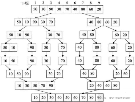- 此时也就是刚才所讲的最后一次执行第 12 行代码,将 {10,30,50,70,90} 与 {20,40,60,80} 归并为最终有序的序列。