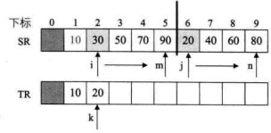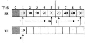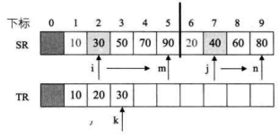 1 | /* 将有序的SR[i..m]和SR[m+1..n]归并为有序的TR[i..n] */ |