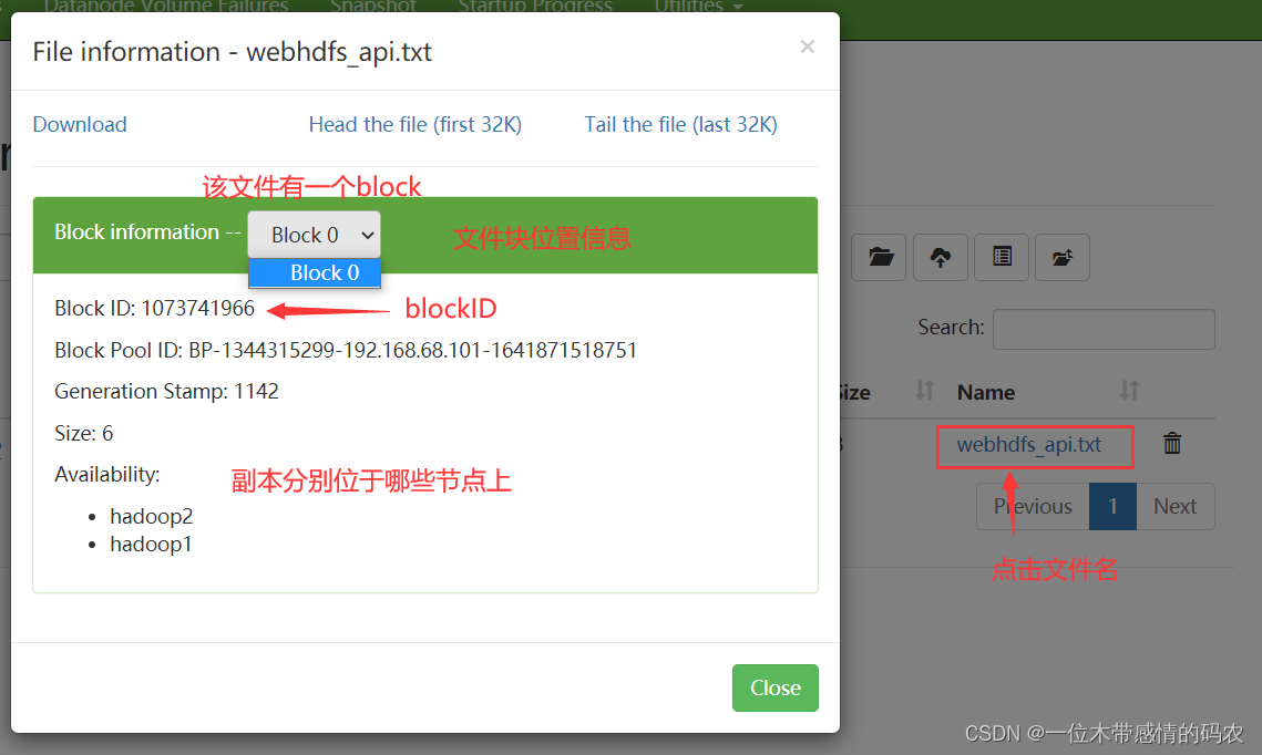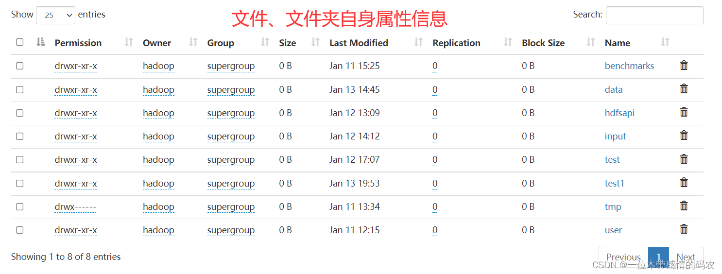 - 文件名称、权限,修改时间,文件大小,复制因子,数据块大小。