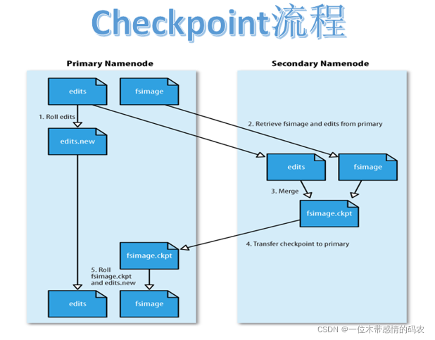 Checkpoint核心是把 fsimage 与 edits log 合并以生成新的 fsimage 的过程。此过程有两个好处:fsimage 版本不断更新不会太旧、edits log 文件不会太大。