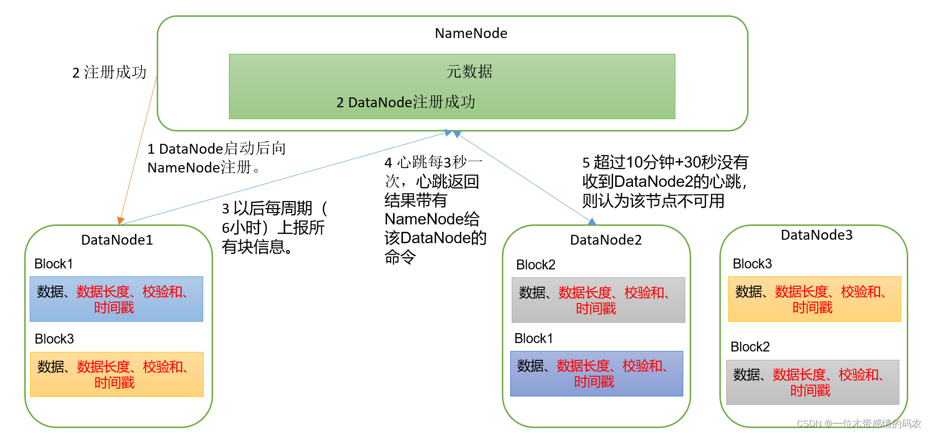 - 一个数据块在 DataNode 上以文件形式存储在磁盘上,包括两个文件,一个是数据本身,一个是元数据包括数据块的长度,块数据的校验以及时间戳。