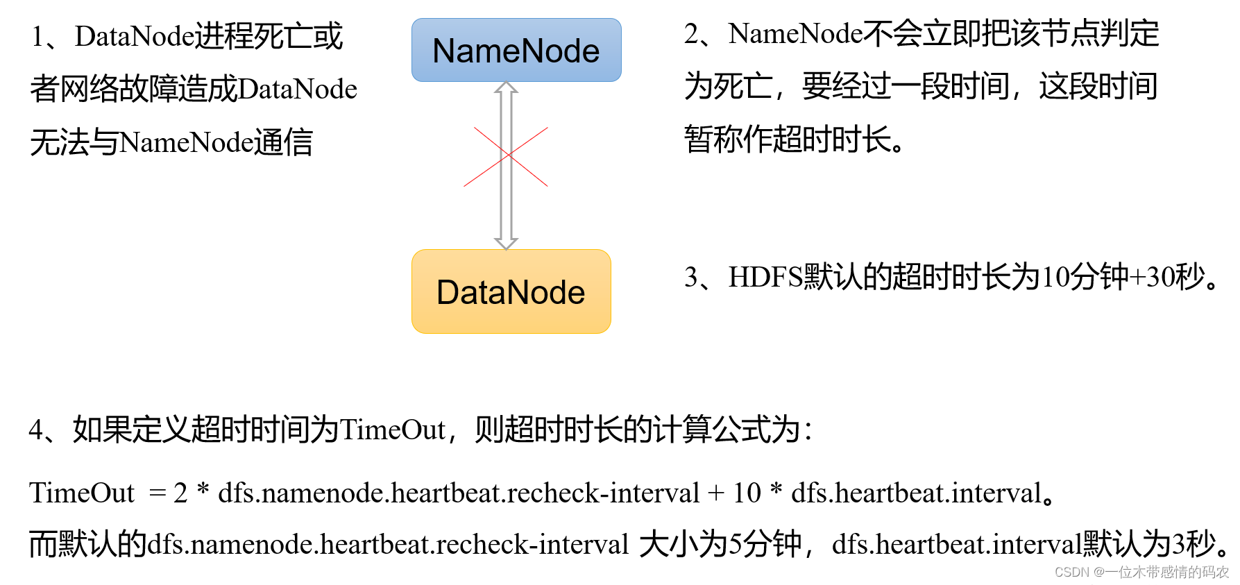 需要注意的是 hdfs-site.xml 配置文件中的heartbeat.recheck.interval的单位为毫秒,dfs.heartbeat.interval的单位为秒。