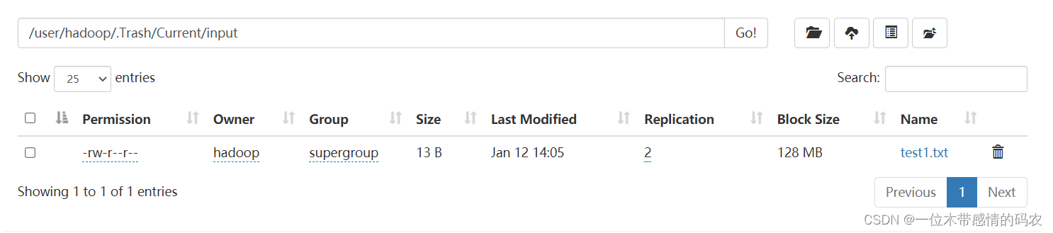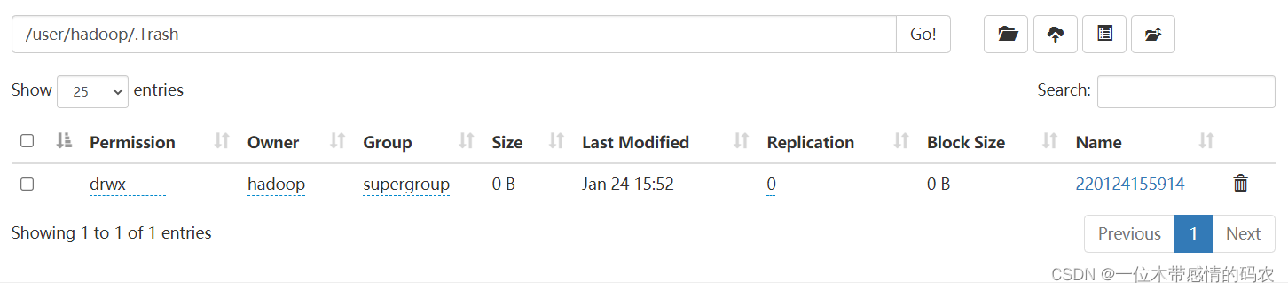 启用 Trash 功能后,从 HDFS 中删除某些内容时,文件或目录不会立即被清除,它们将被移动到回收站Current目录中(/user/${username}/.Trash/current)。