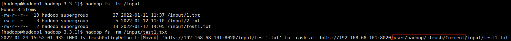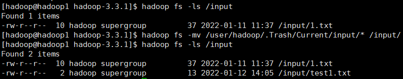hadoop fs -mv /user/hadoop/.Trash/Current/input/* /input/