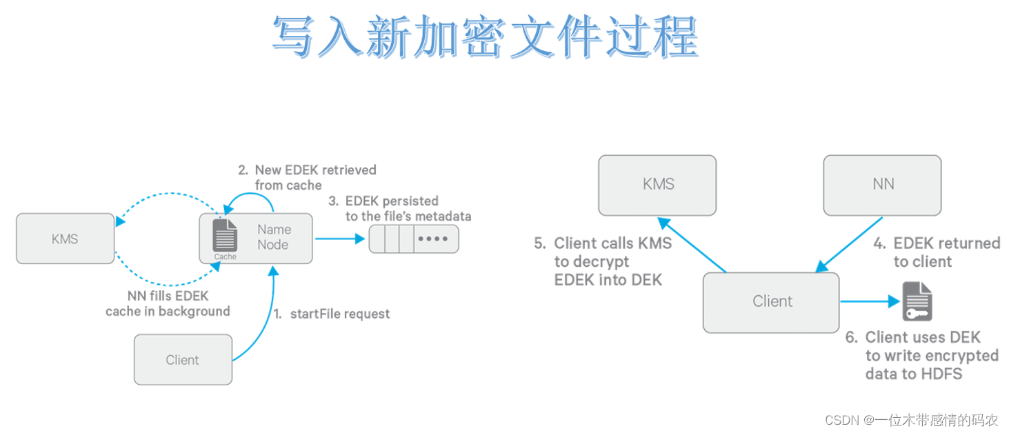 HDFS透明加密(Transparent Encryption)支持端到端的透明加密,启用以后,对于一些需要加密的 HDFS 目录里的文件可以实现透明的加密和解密,而不需要修改用户的业务代码。端到端是指加密和解密只能通过客户端。对于加密区域里的文件,HDFS 保存的即是加密后的文件,文件加密的秘钥也是加密的。让非法用户即使从操作系统层面拷走文件,也是密文,没法查看。