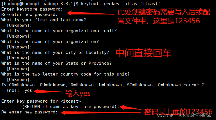 1 | [hadoop@hadoop1 hadoop-3.3.1]$ keytool -genkey -alias 'itcast' |