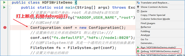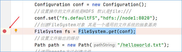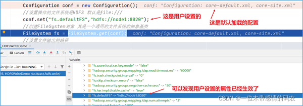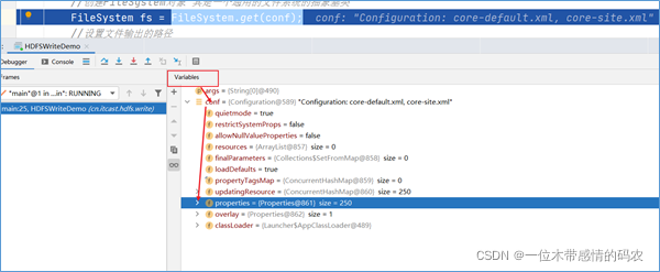 按下shift+F8,跳出Configuration类的创建,按F8执行下一步,当到达FileSystem.get(conf)这一行代码的时候,可以发现用户通过conf.set设置的属性也会被加载。