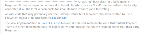 简单翻译下:FileSystem类是一个通用的文件系统的抽象基类。具体来说它可以实现为一个分布式的文件系统,也可以实现为一个本地文件系统。所有的可能会使用到 HDFS 的用户代码在进行编写时都应该使用 FileSystem 对象。