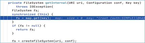 经过方法的层层调用,最终找到了FileSystem对象是通过调用getInternal方法得到的。