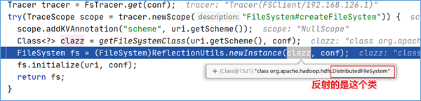 原来,FileSystem实例是通过反射的方式获得的,具体实现是通过调用反射工具类ReflectionUtilsnewInstance方法并将 class 对象以及Configuration对象作为参数传入最终得到了FileSystem实例。