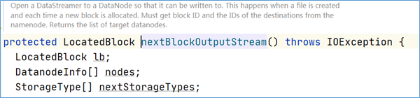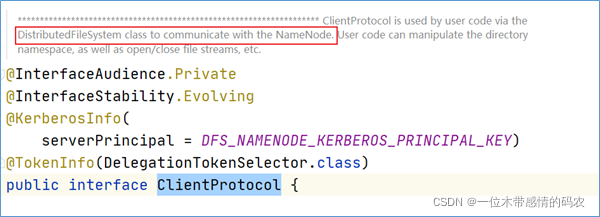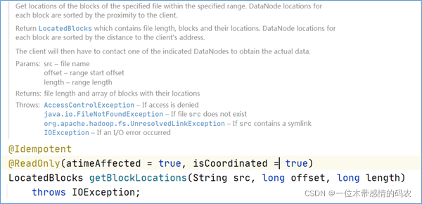 通过源码可以发现,getBlockLocations方法是位于ClientProtocol这个接口中。在ClientProtocol的注释上可以得出信息,这是客户端和 namenode 进行通信的。
