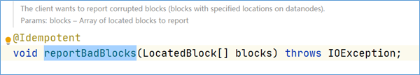 客户端会调用ClientProtocol.reportBadBlocks()方法向 Namenode 汇报错误的数据块。当客户端从数据节点读取数据块且发现数据块的校验和并不正确时,就会调用这个方法向 Namenode 汇报这个错误的数据块信息。