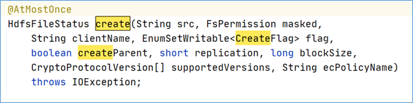 create()方法用于在 HDFS 的文件系统目录树中创建一个新的空文件,创建的路径由 src 参数指定。这个空文件创建后对于其他的客户端是 “可读” 的,但是这些客户端不能删除、重命名或者移动这个文件,直到这个文件被关闭或者租约过期。客户端写一个新的文件时,会首先调用create方法在文件系统目录树中创建一个空文件,然后调用addBlock方法获取存储文件数据的数据块的位置信息,最后客户端就可以根据位置信息建立数据流管道,向数据节点写入数据了。