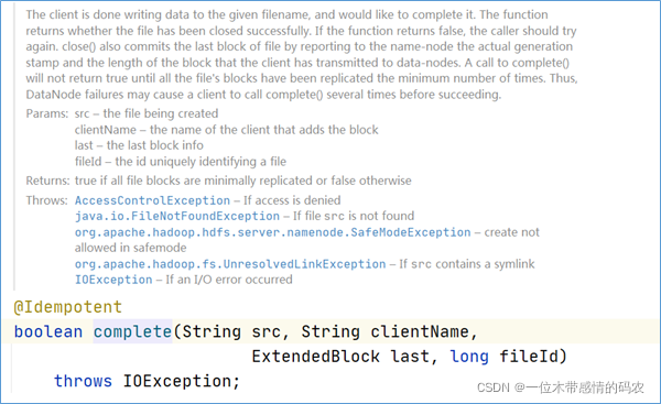 ClientProtocol 定义了所有由客户端发起的、由 Namenode 响应的操作。这个接口非常大,有 80 多个方法,核心的是:HDFS文件读相关的操作HDFS文件写以及追加写的相关操作