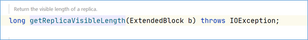 • 客户端会调用getReplicaVisibleLength()方法从数据节点获取某个数据块副本真实的数据长度。当客户端读取一个 HDFS 文件时,需要获取这个文件对应的所有数据块的长度,用于建立数据块的输入流,然后读取数据。但是 Namenode 元数据中文件的最后一个数据块长度与 Datanode 实际存储的可能不一致,所以客户端在创建输入流时就需要调用getReplicaVisibleLength()方法从 Datanode 获取这个数据块的真实长度。
