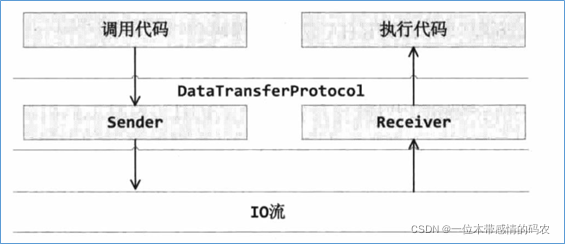 DataTransferProtocol 接口调用并没有使用 Hadoop RPC 框架提供的功能,而是定义了用于发送 DataTransferProtocol 请求的 Sender 类,以及用于响应 DataTransferProtocol 请求的 Receiver 类。