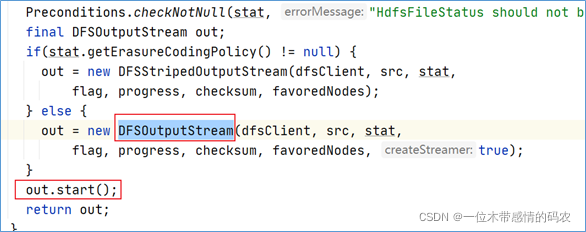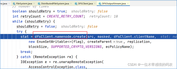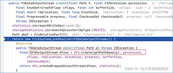 可以通过create()方法调用不断跟下去,可以发现最终的调用也验证了上述结论,返回的是DFSOutputStream