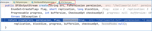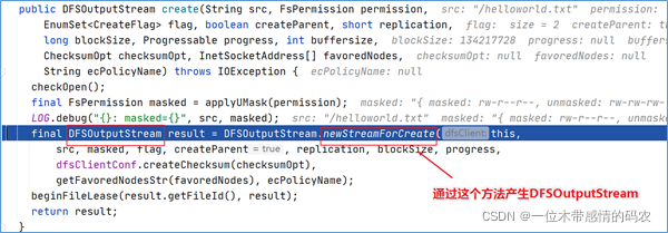 点击进入代码DFSOutputStream dfsos = dfs.create可以发现,DFSOutputStream这个类是从DFSClient类的create方法中返回过来的。