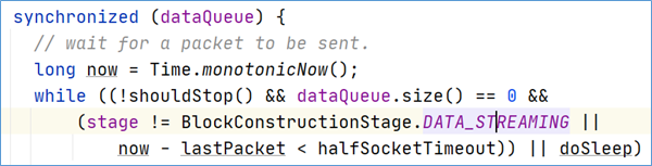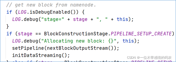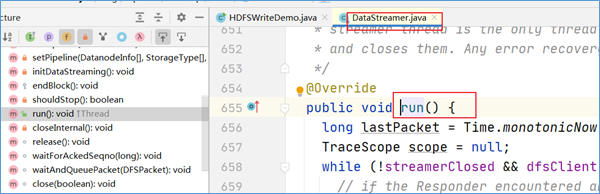 DataStreamer类是DFSOutputSteam的一个内部类,在这个类中,有一个方法叫做run方法,数据写入的关键代码就在这个run方法中实现。