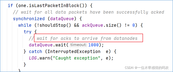 DFSOutputStream也维护着一个内部数据包队列来等待 DataNode 的收到确认回执,称之为确认队列(ack queue),收到pipeline中所有 DataNode 确认信息后,该数据包才会从确认队列删除。