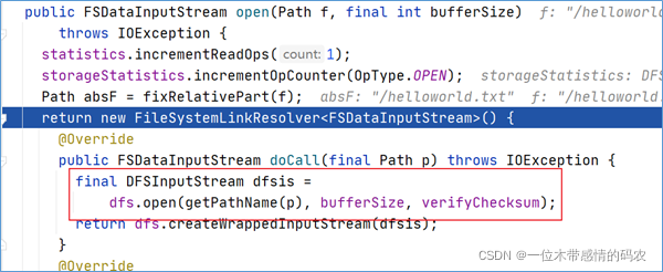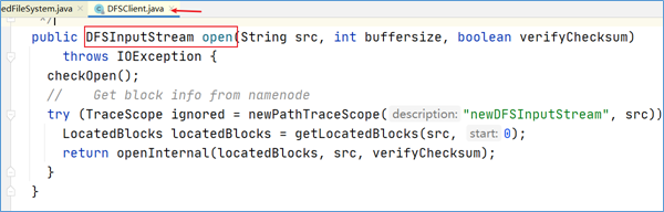 点击进入代码DFSInputStream dfsis = dfs.open()可以发现,DFSInputStream这个类是从DFSClient类的open方法中返回过来的。该输入流从 namenode 获取 block 的位置信息。