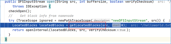 在上述open方法中,有一个核心方法调用叫做getLocatedBlocks,见名知意,该方法是用于获取块位置信息的。