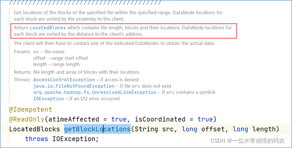 继续点下去,发现最终调用的是getBlockLocations方法。