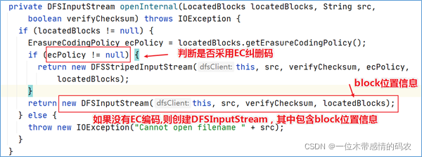 点击进入该方法可以发现,分了两种不同的输入流。这取决于文件的存储策略是否采用 EC 纠删码。如果未使用EC编码策略存储,那么直接创建DFSInputStream