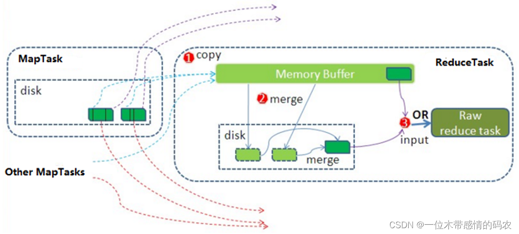 整个 reducetask 分为 3 个阶段:copy 拉取数据、sort 排序数据、reduce 处理数据。