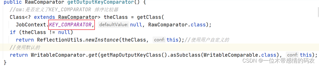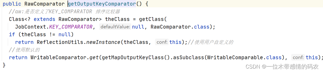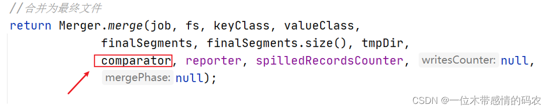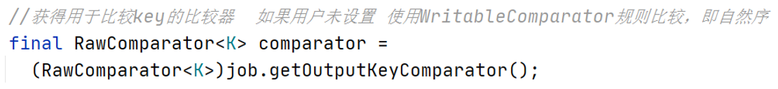 在合并的过程中,会对数据进行 Sort 排序,默认情况下是 key 的字典序(WritableComparable),如果用户设置比较器,则以用户设置的为准。