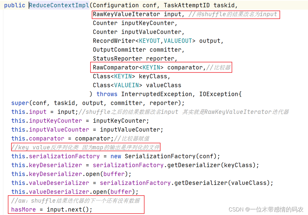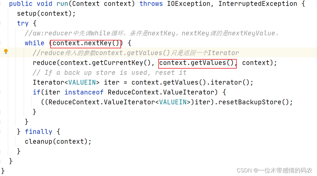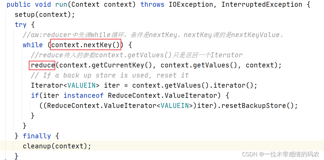 首先在 Reduce.run 中调用 context.nextKey() 决定是否进入 while,,然后调用 nextKeyValue 将 key/value 的值从 input 中读出,其次通过 context.getValues 将 Iterator 传入 reduce 中,在 reduce 中通过 Iterator.hasNext 查看此 key 是否有下个 value,然后通过 Iterator.next 调用 nextKeyValue 去 input 中读取 value。