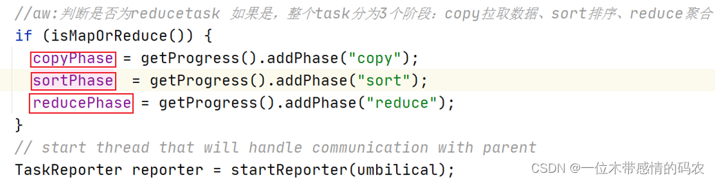 ReduceTask类作为 reducetask 的一个载体,调用的就是里面的 run 方法,然后开启 reduce 任务。