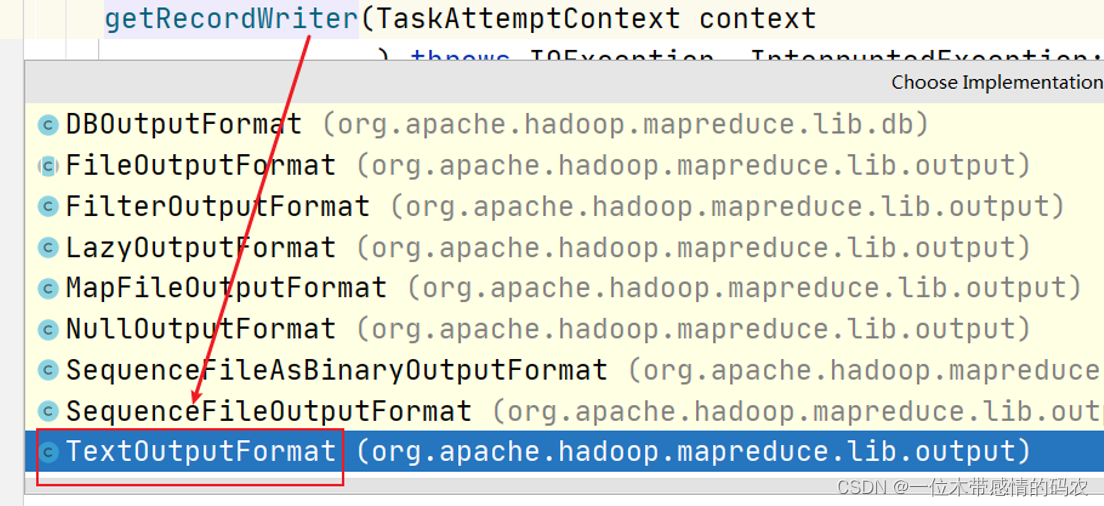 负责输出数据的组件叫做 OutputFormat,默认实现是TextOutPutFormat。而真正负责写数据的组件叫做 LineRecordWriter,Write 方法就定义在其中,这一点和输入组件很是类似。