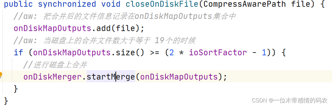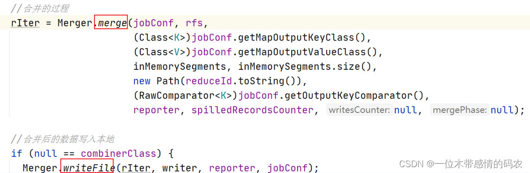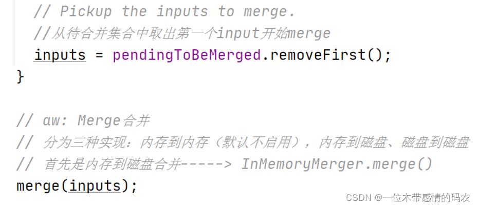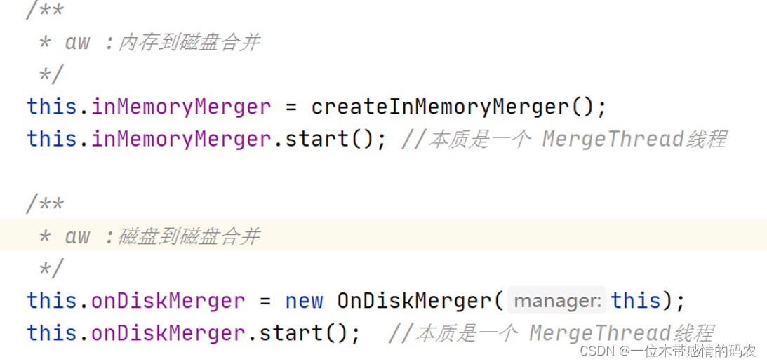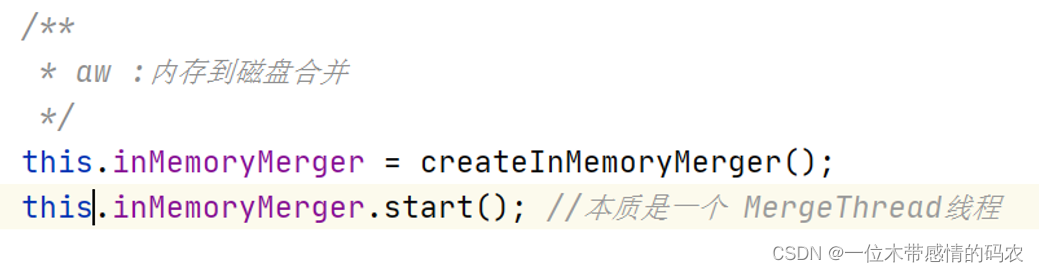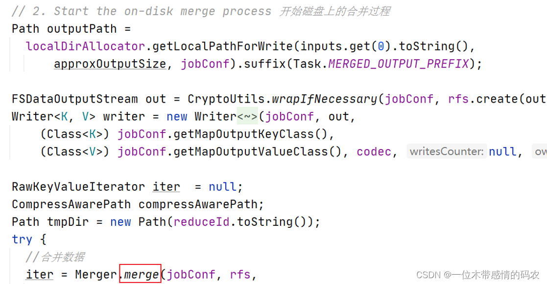 在启动 Fetcher 线程 copy 数据过程中已经启动了两个 merge 线程,分别为inMemoryMerger和onDiskMerger,分别将内存中的数据 merge 到磁盘和将磁盘中的数据进行 merge。