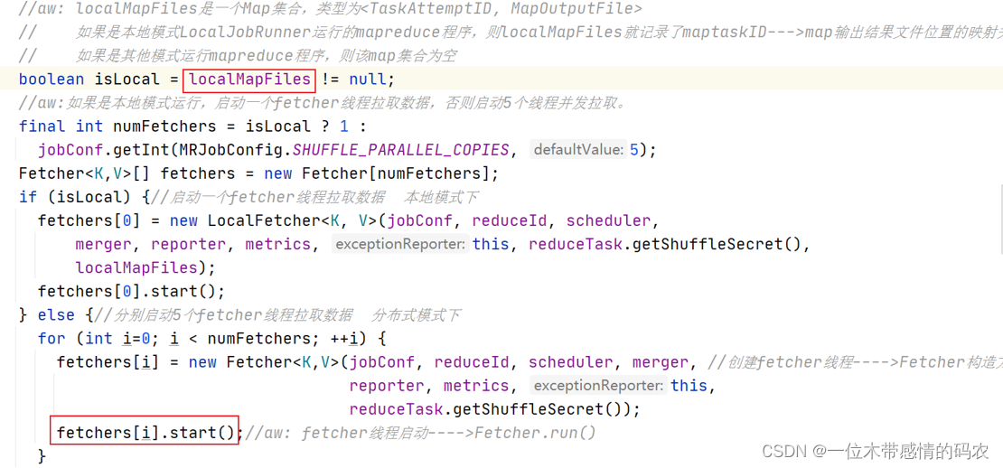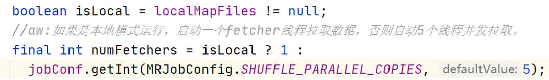 Reduce 进程启动一些数据 copy 线程(Fetcher),通过 HTTP 方式请求 maptask 获取属于自己的文件。如果是本地模式运行,启动一个 fetcher 线程拉取数据,否则启动 5 个线程并发拉取。