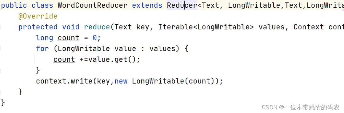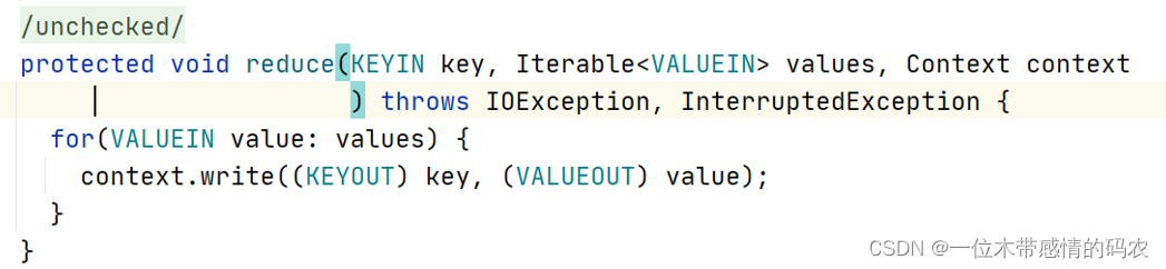 对于 reduce 方法,如果用户不重写,父类中也有默认实现逻辑。其逻辑为:输入什么,原封不动的输出什么,也就意味着不对数据进行任何处理。