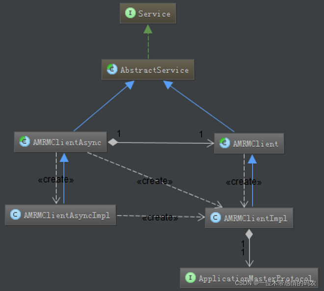 其中,AMRMClient 是阻塞式的,实现了 ApplicationMasterProtocol 协议,用户调用该类的相应接口,可实现 AM 与 RM 的通信。而 AMRMClientAsync 是 AMRMClient 的非阻塞式封装,所有响应通过回调函数的形式返回给用户,用户实现自己的 AM 时,只需要实现 AMRMClientAsync 的 CallbackHandler 即可。