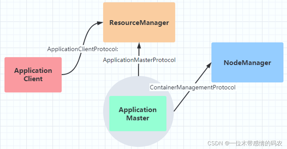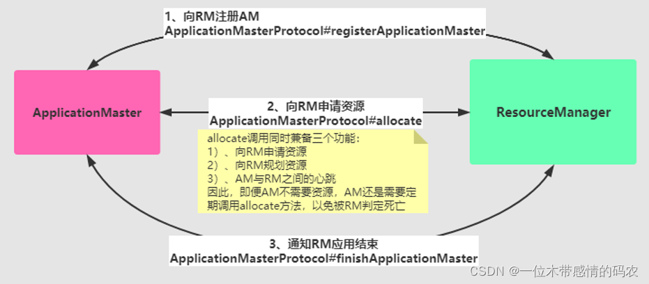 AM 的主要功能是按照业务需求,从RM处申请资源,并利用这些资源完成业务逻辑。因此,AM 既需要与 RM 通信,又需要与 NM 通信,涉及两个协议,分别是 AM-RM 协议(ApplicationMasterProtocol)和 AM-NM 协议(ContainerManagementProtocol),如下图所示: