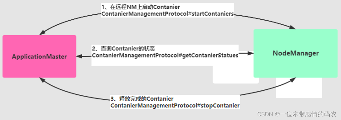 AM 通过 ContainerManagementProtocol 协议与 NM 交互,包括 3 个方面的功能:启动容器、查询容器状态、停止容器,分别对应协议中的三个方法: